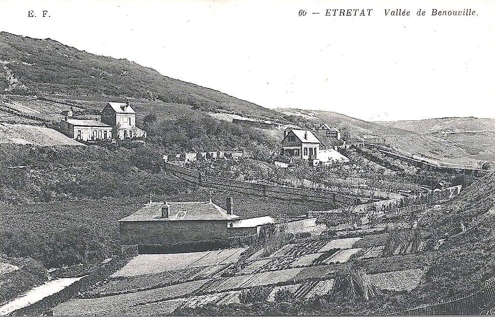 Maisons étretataises en 1851 (carte postale de la collection Davanne) : au milieu du XXe s., une bonne partie des habitations était encore couvertes en chaume ; les toitures d’ardoises se généraliseront dans les années suivantes