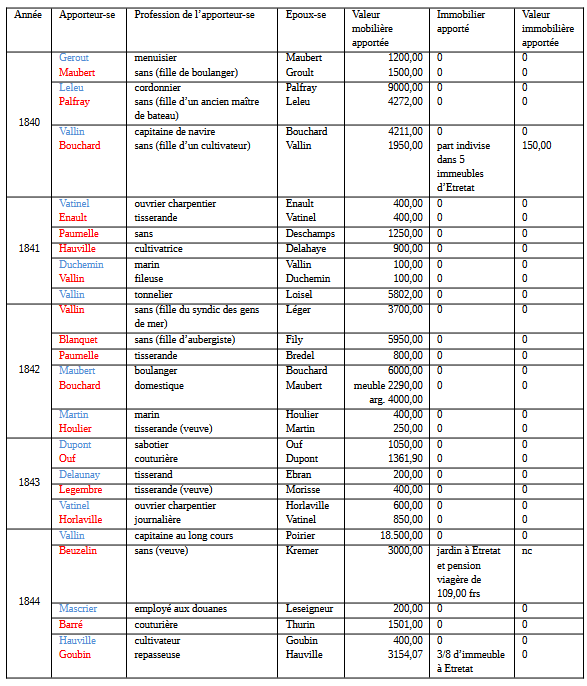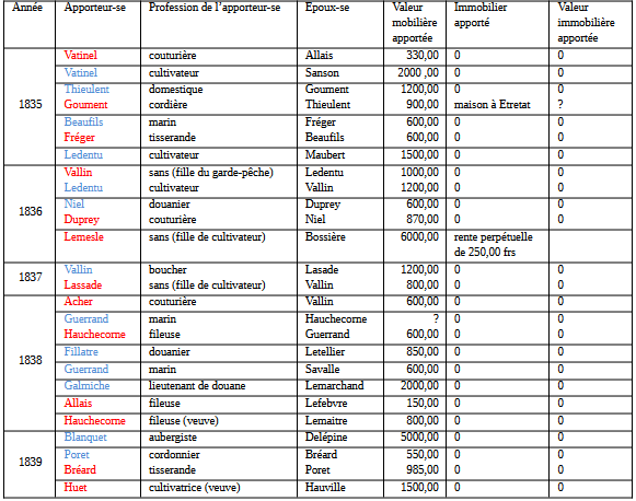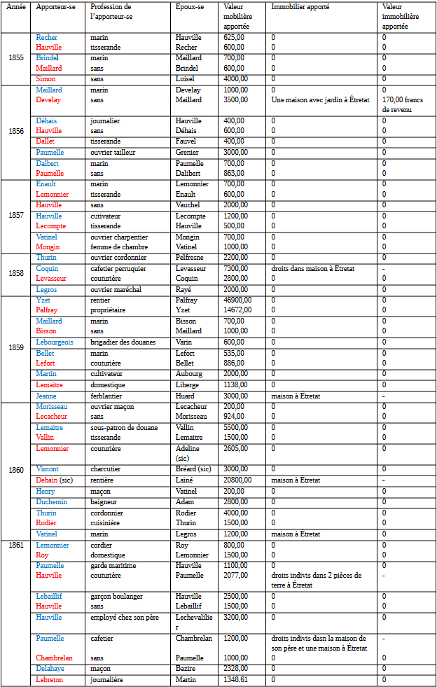 Dans les années 1830, la fourchette de valeur des apports mobiliers de chacun des futurs conjoints va de 150 à 6000 francs, soit un rapport de 1 à 40 ; la médiane est de 870 francs. Du côté des moins bien dotés, on trouve les marins (même si cette catégorie est sous-représentée chez les contractants) et les travailleuses du textile ; du côté des plus nantis : les cultivateurs et cultivatrices (qui ont tous des apports supérieurs à 1200 francs) et quelques commerçants enrichis, comme l’aubergiste Blanquet (plus précisément son fils, qui lui succède) (https://www.etretat.carnetsdepolycarpe.com/2020/12/21/maisons-de-confiance-familles-de-commercants-et-artisans/ et https://www.etretat.carnetsdepolycarpe.com/2024/04/03/lage-des-mutations-etretat-entre-1830-et-1860/). Angélique Bérénice Lemesle, qui déclare la plus forte valeur pour cette période, était native de Bénouville et appartenait à une famille de propriétaires cultivateurs établie à Étretat et Bénouville.