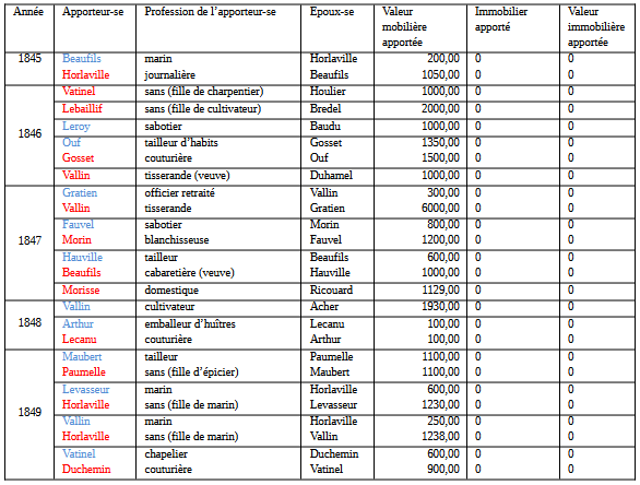 Dans la première moitié de la décennie précédant le Second Empire, les valeurs augmentent globalement : la médiane est de 1310 francs, mais l’écart se creuse entre les apports les plus faibles (100 francs) et le plus élevé (18.500 francs), avec un rapport de 1 à 185. Plus du quart des valeurs sont inférieures à 500 francs (contre 8 % précédemment). Parmi les moins fortunés on retrouve des marins et des ouvriers tandis que les mieux pourvus sont des artisans-commerçants (un cordonnier, un boulanger, un tonnelier), la fille d’un meunier-boulanger et la fille de l’aubergiste Blanquet déjà cité, ainsi que des capitaines de navire.