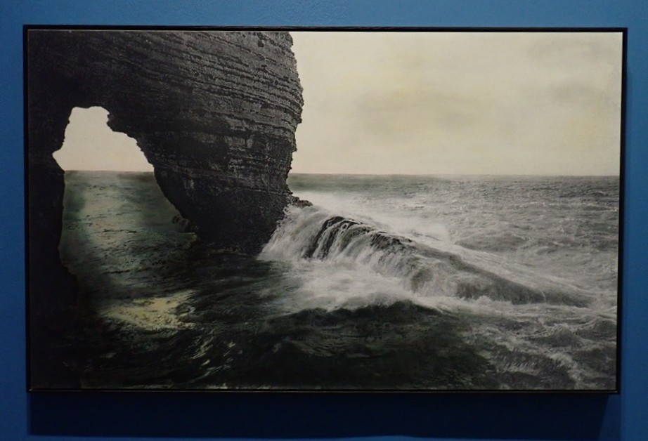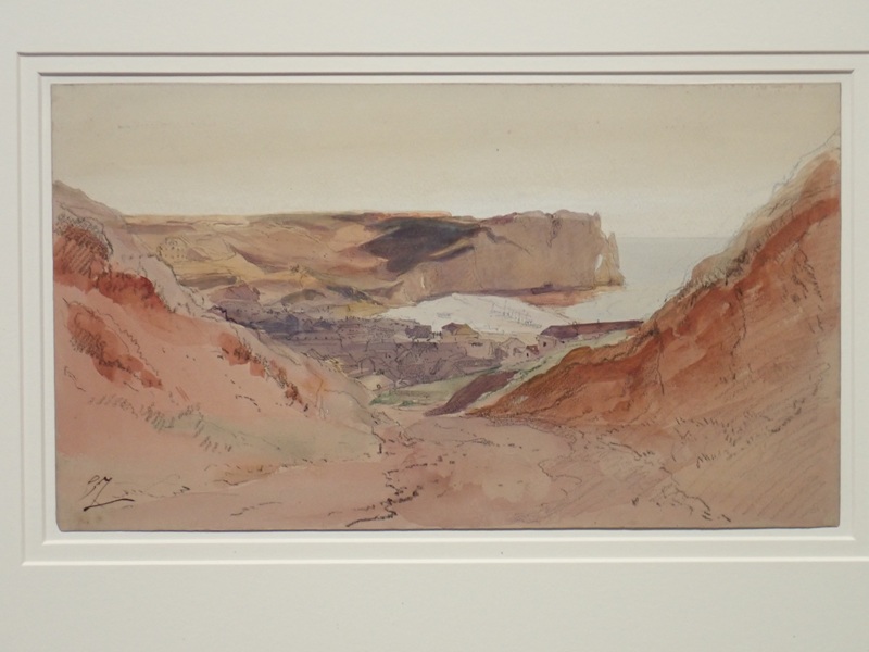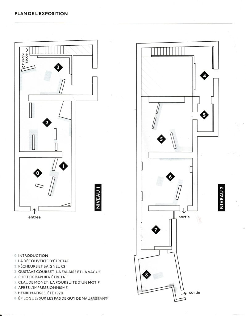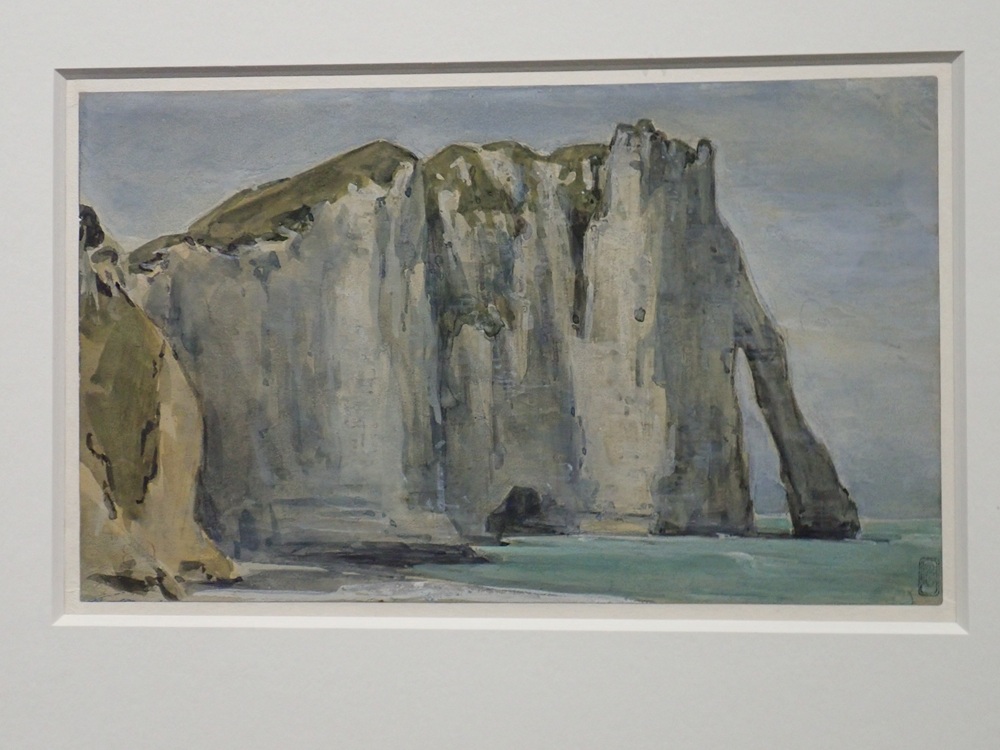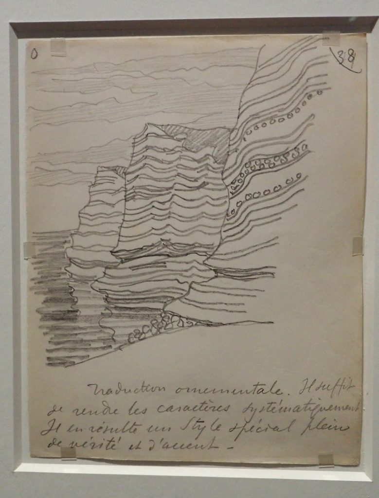 La salle qui clôture l’exposition propose des tirages grand format de quelques photographies récentes de Balthasar Burkhard et d’Elger Esser qui « interrogent le mythe d’Étretat » ; autrement dit elles reprennent plus ou moins les motifs dont se sont emparés les peintres successifs. Chacun jugera de l’intérêt artistique de la démarche. Sont également exposés, sur un dernier mur, les croquis envoyés par Guy de Maupassant dans un courrier adressé à Gustave Flaubert pour guider l’écrivain rouennais dans la rédaction du périple géologique de ses héros Bouvard et Pécuchet le long des falaises étretataises (https://www.etretat.carnetsdepolycarpe.com/2026/01/08/dictionnaire-des-toponymes-etretatais/).