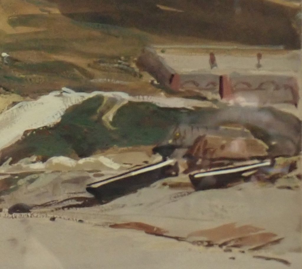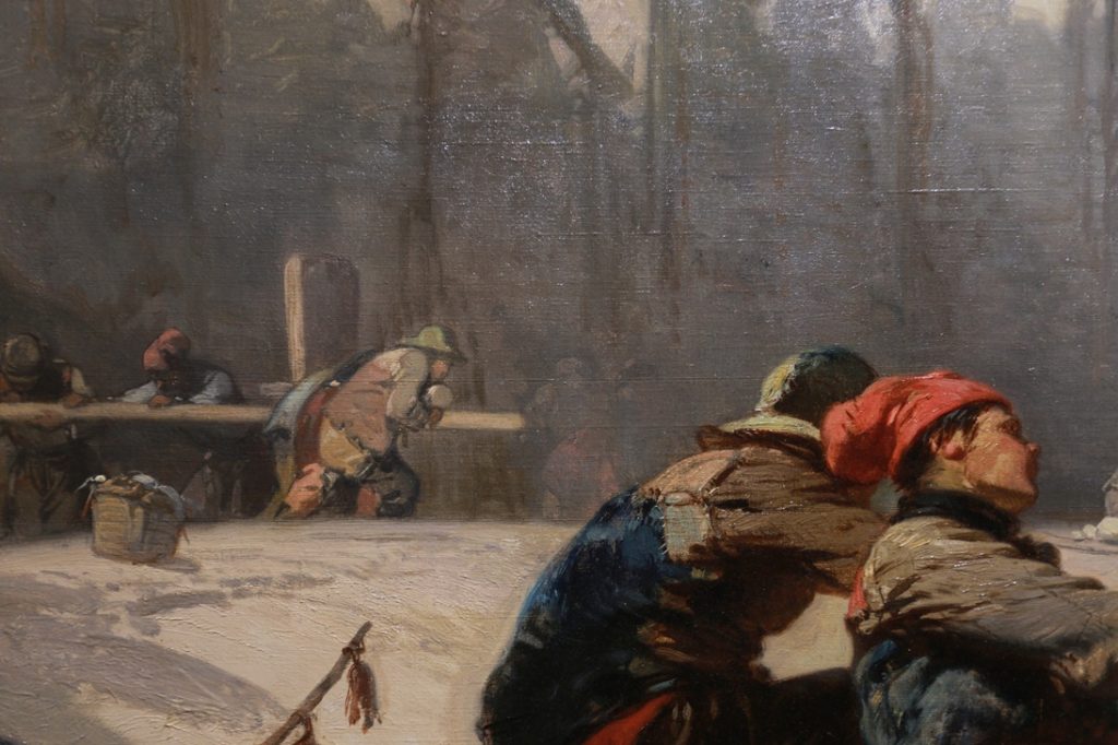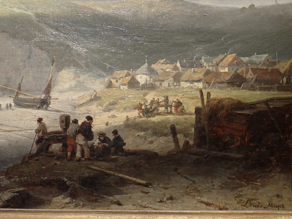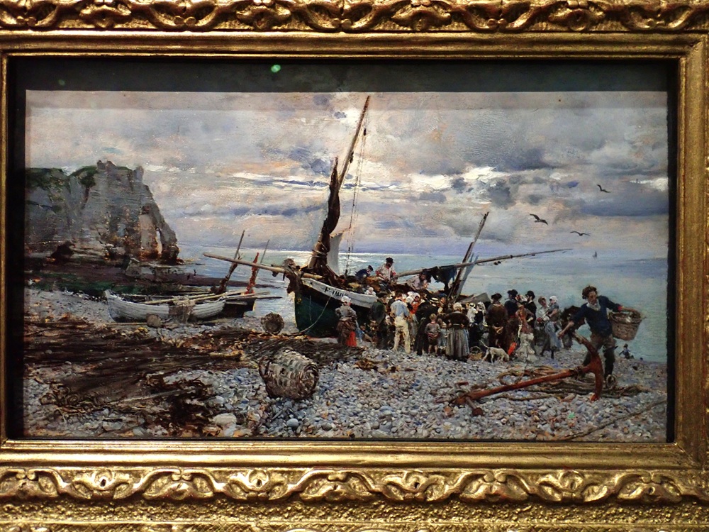Un troisième Eugène est la vedette de la deuxième salle, dont le thème dichotomique est « Pêcheurs et baigneurs ». Il s’agit évidemment d’Eugène Le Poittevin, qui fut le premier artiste résident à Étretat – saisonnier tout au moins, et qui s’intéressa à ces deux mondes cohabitant tout au long de la seconde moitié du XIXe siècle. Ses œuvres les plus connues, dont beaucoup ont été prêtées par le Musée des Pêcheries de Fécamp (qui lui consacra une exposition en 2020), figurent en bonne place. Le thème des pêcheurs et de la population locale est aussi illustré par des tableaux de Hugues Merle et de Giovanni Boldoni et par une gravure d’Alfred Taiée montrant la coexistence des barques et des bains de mer tandis que les estivants sont représentés, entre autres, sur des photographies anciennes et – de manière plus grotesque – sur une gravure de Gustave Doré.