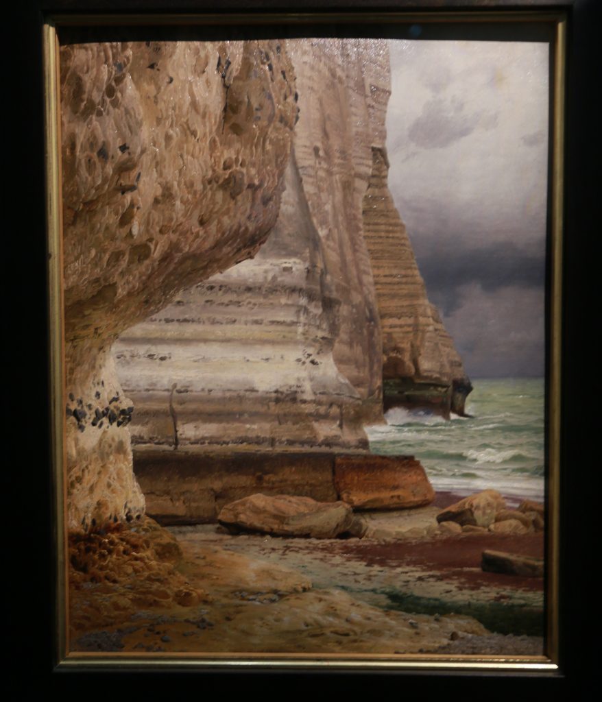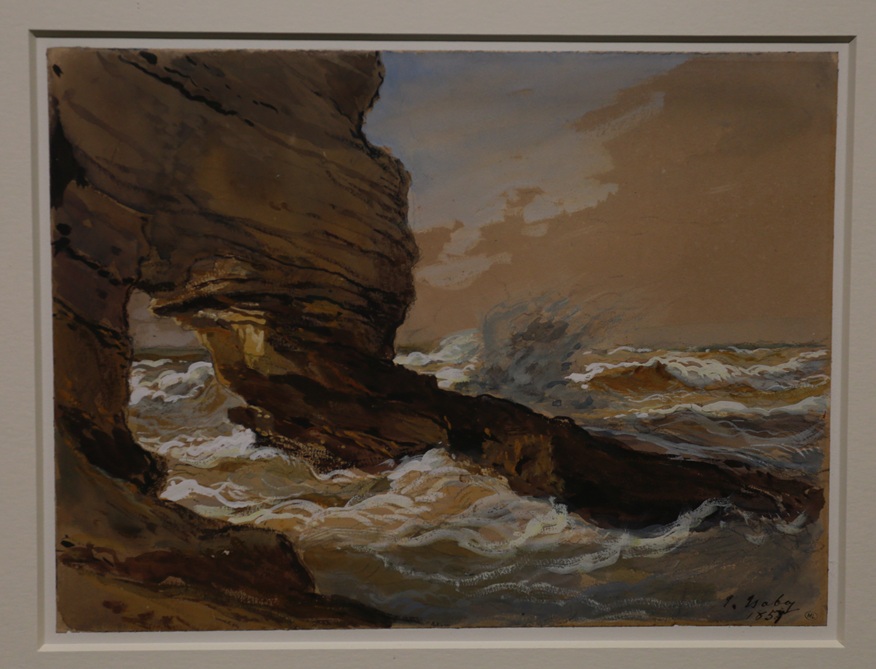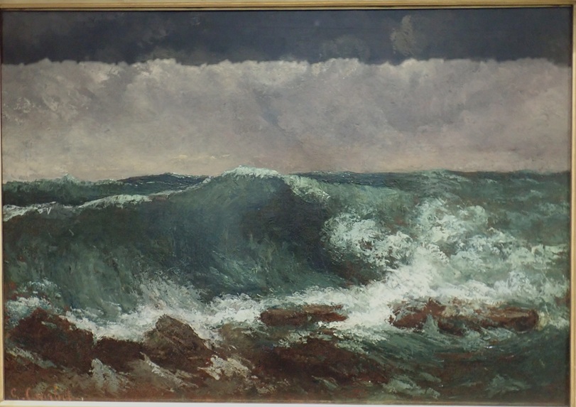 Gustave Courbet est le point de mire de la 3e salle, qui est la dernière de cet étage. La série des Vagues, dont les différentes variantes sont dispersées dans plusieurs musées du monde entier, est une réponse au défi posé par la représentation picturale d’une nature mouvante. Inspiré par la météo étretataise, Courbet préfère se frotter à l’impétuosité des éléments plutôt que de céder aux attraits qu’offrirait une nature apaisante (https://www.etretat.carnetsdepolycarpe.com/2021/11/07/tempetes-et-naufrages-a-propos-dune-exposition/).