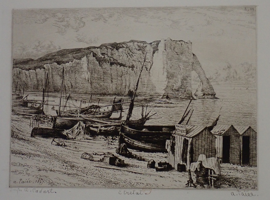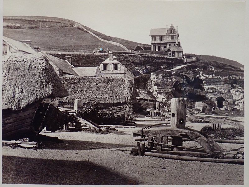 Au terme d’un escalier menant au second niveau de l’exposition lyonnaise, le couloir formant la 4e salle « Photographier Étretat », propose des cliches datant du Second Empire, dont les auteurs sont Paul Gaillard, les frères Louis-Auguste et Auguste-Rosalie Bisson et surtout Alphonse Davanne, scientifique et inventeur, qui présida la Société française de photographie entre 1876 et 1901. Certains clichés de ce dernier, provenant de la collection de son fils Maurice, furent édités par la suite en cartes postales par le syndicat d’initiative d’Étretat ; ils illustrent ainsi, aux côtés de la série de vues du début du siècle éditées par les frères Neurdein, ce qu’étaient le paysage et la vie à Étretat du Second Empire jusqu’à la Belle Époque. (https://www.etretat.carnetsdepolycarpe.com/2023/08/01/la-belle-epoque-etretat-avant-guerre/)
