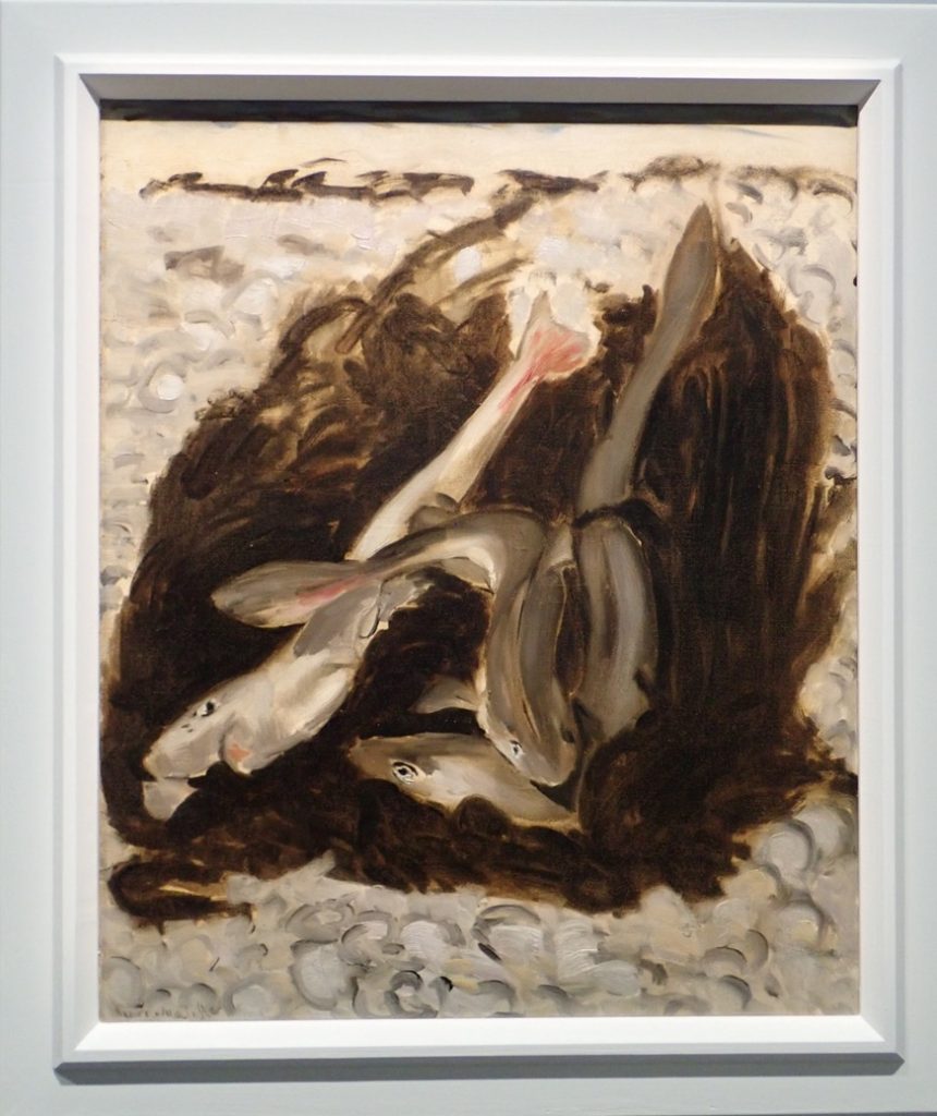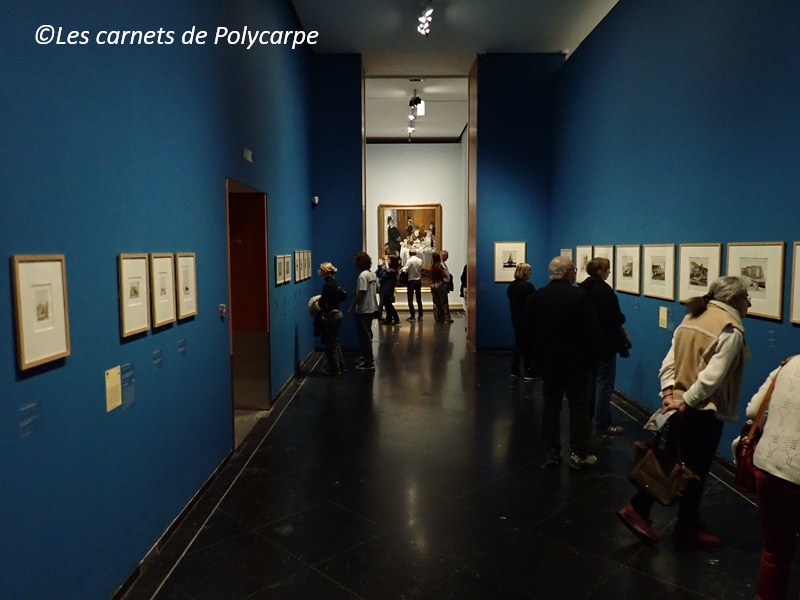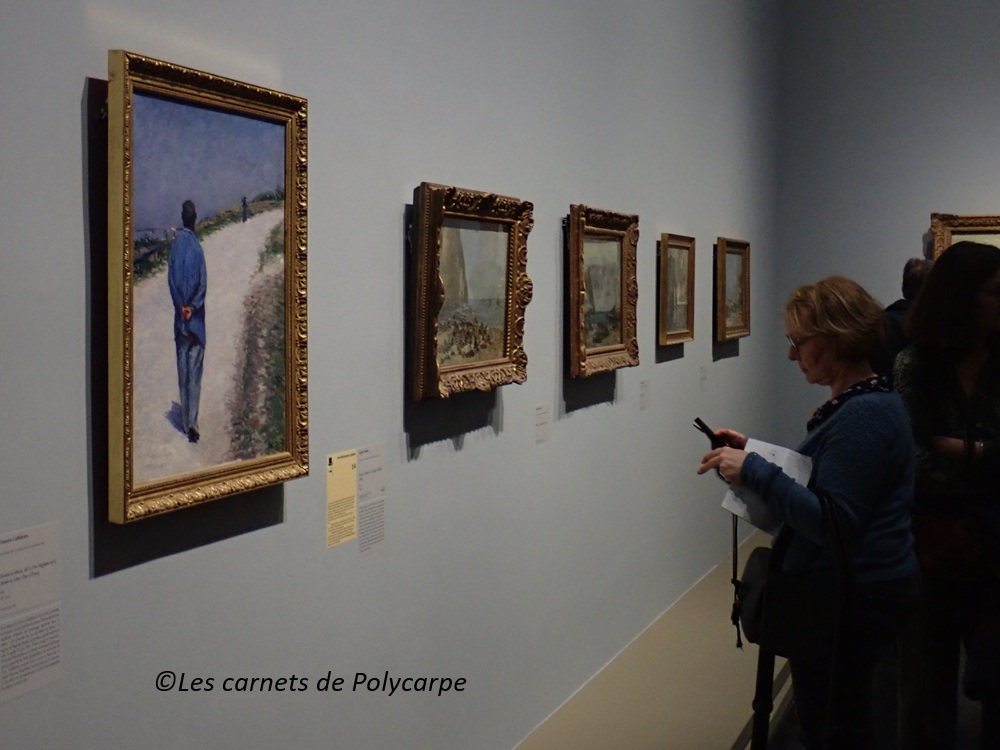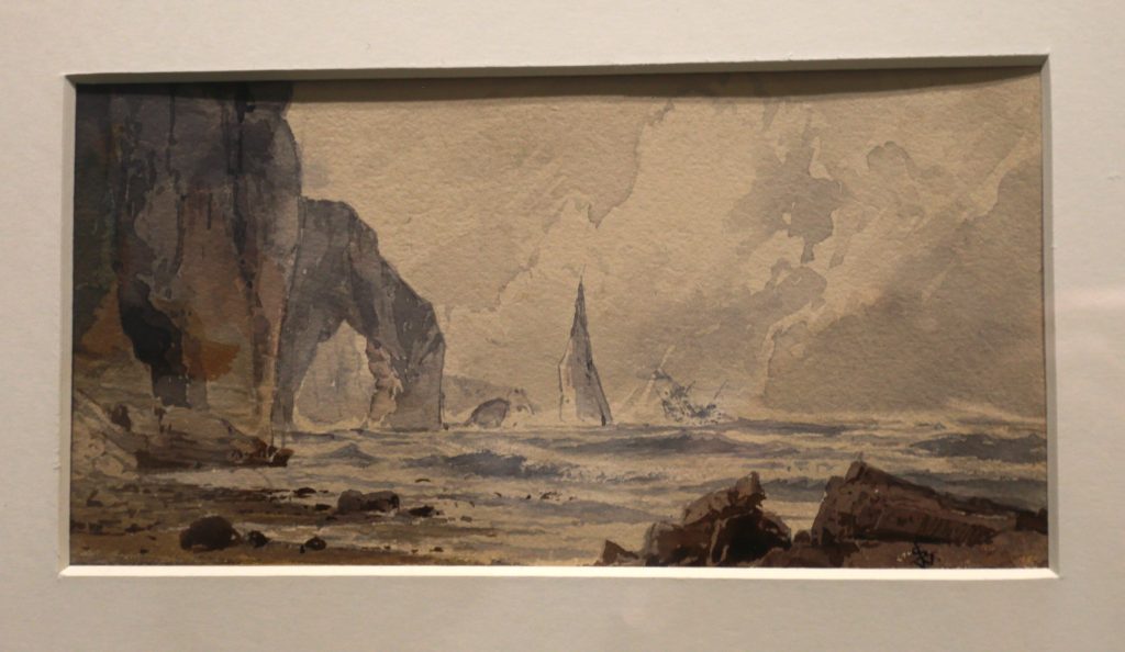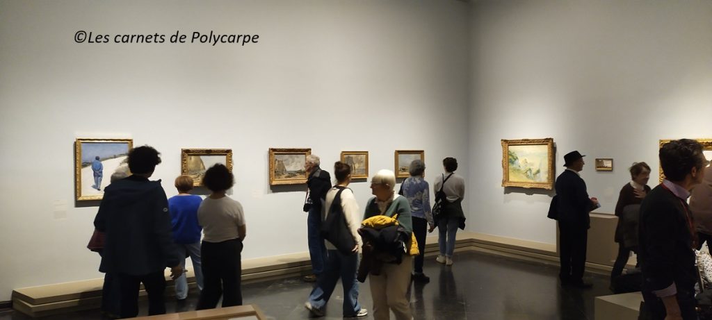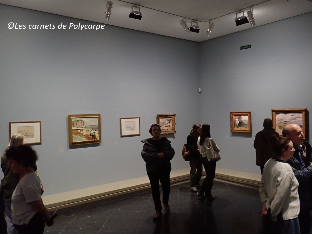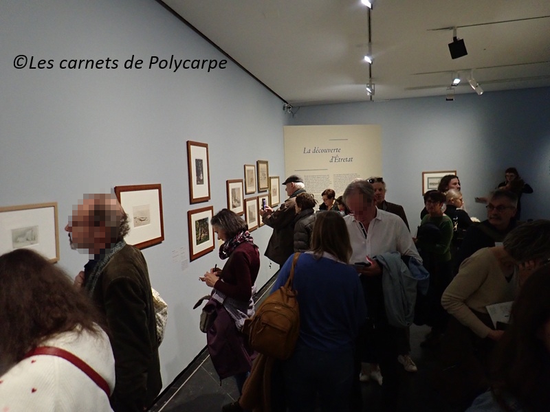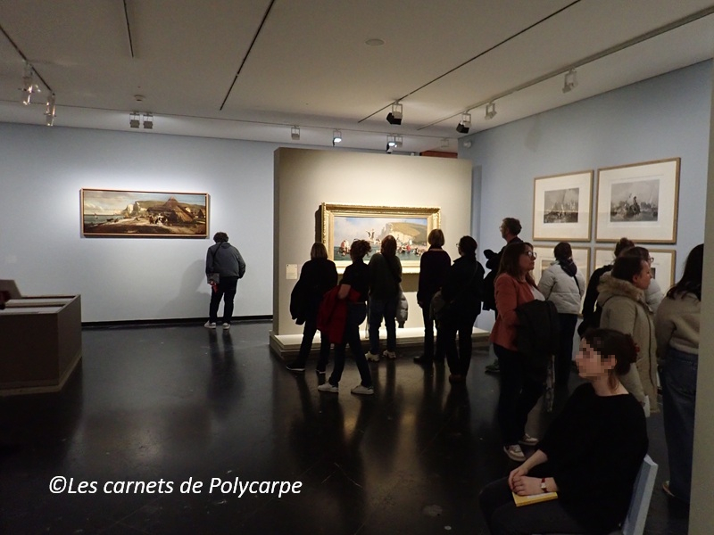 Autre vue de la deuxième salle de l’exposition ; au centre du cliché, Bains de mer à Étretat, peinture de 1866 d’Eugène Le Poittevin ; sur le mur du fond, L’enseigne peinte en 1842 par Eugène Le Poittevin pour l’auberge Blanquet (https://www.etretat.carnetsdepolycarpe.com/2025/12/24/les-blanquet-une-success-story-etretataise/) ; sur le mur de droite, les 4 lithographies de la série La vie d’une caïque (1856)